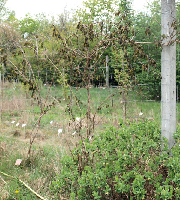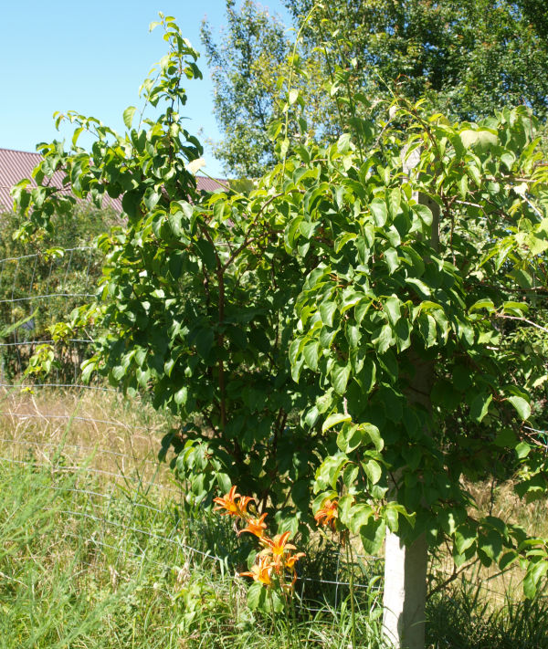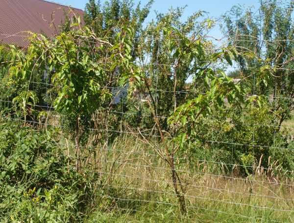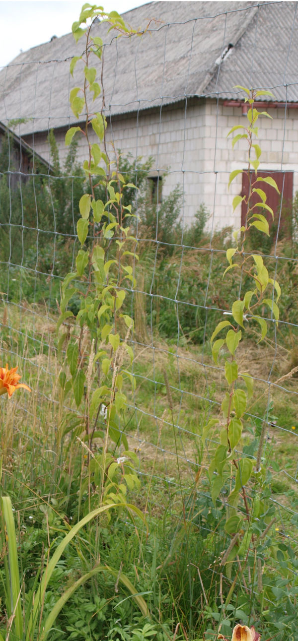 | Pozostałe trzy sadzonki z drugiej dostawy, jedna w środku szpaleru i dwie najbardziej wysunięte na wschód, rosły słabo. Mierzyły w lipcu 2020 r. 40, 25 i 40 cm.