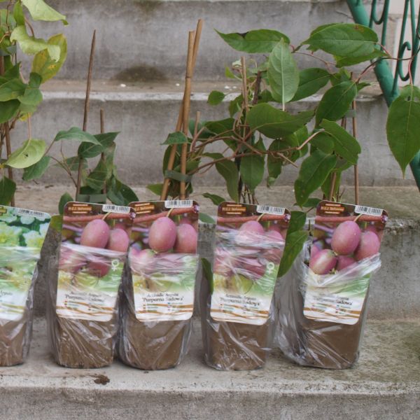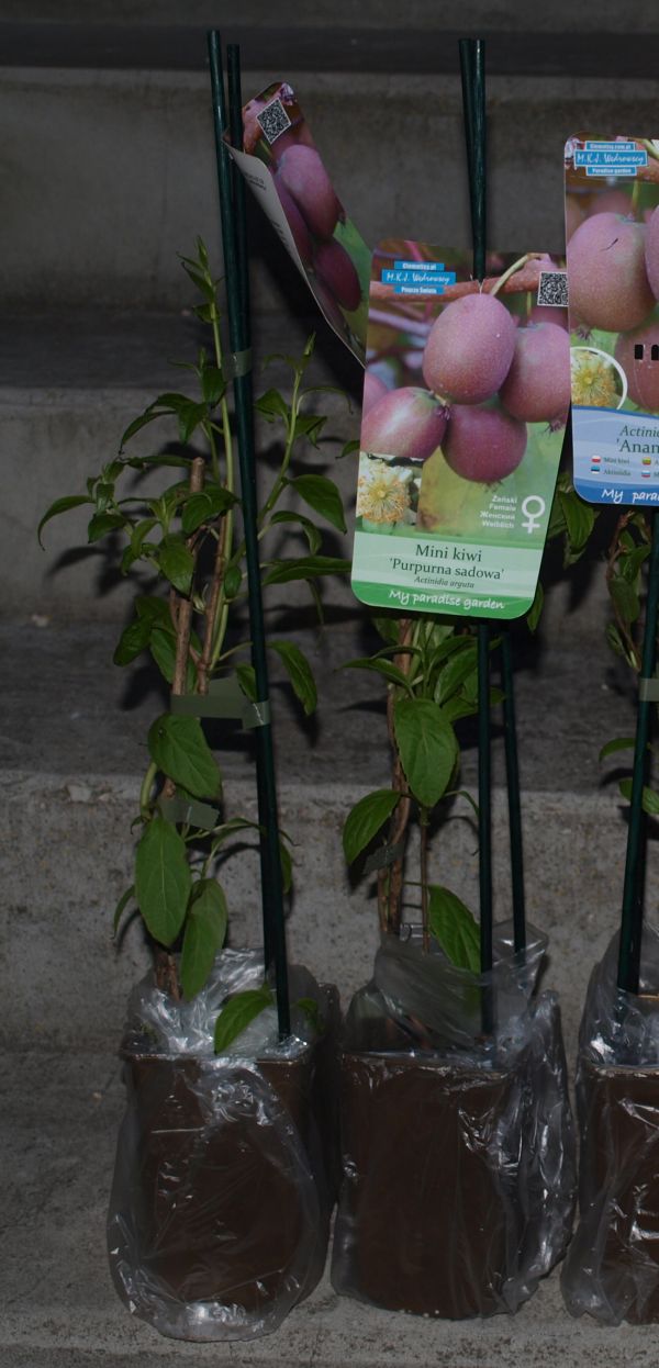 Informacja od dostawcy: Clematisy Kiwi (Actinidia arguta) ‘Purpurna Sadowa’ ostrolistna Ukraińska, czerwono-owocowa, bardzo plenna odmiana o smacznych, trwałych owocach mini kiwi. Zaczyna owocowanie w 3-4 roku, wytrzymuje mrozy do około -28C.Idealna do uprawy w polskich warunkach klimatycznych. Owoce kiwi są bardzo zdrowe, nie zawierają tłuszczu, mają dużo potasu i różnych mikroelementów, w tym cynk, są bardzo bogate w witaminy, w tym również w witaminę C. Owoce aktinidii ostrolistnej zawierają 4 razy więcej witaminy C niż cytryny!!! Zastosowanie: Nadaje się do sadzenia przy różnych podporach, altanach, pergolach i siatkach. Można prowadzić przy drutach rozciągniętych między słupami. Szczególnie przydatna do stosowania w ogrodach przydomowych, na działkach i na plantacjach produkcyjnych. Kwitnienie: Na początku czerwca, kwiaty białe. Dojrzewanie: Owoce dojrzewają pod koniec września – października, nadają się do jedzenia ze skórką. Owoce są owalne, około 3,5 cm długości i 2,5 cm szerokości, dobrze oświetlone są czerwone. Owocowanie: Rozpoczyna owocowanie w 3-4 roku. Wytrzymuje mrozy do około -28oC. Wymaga stanowisk ciepłych, nasłonecznionych, osłoniętych, gleby wilgotnej, ale dobrze zdrenowanej, żyznej. Do zapylenia i zawiązania owoców niezbędna jest w pobliżu roślina męska tego samego gatunku (np. męska ‘Weiki’). Pędy wijące.