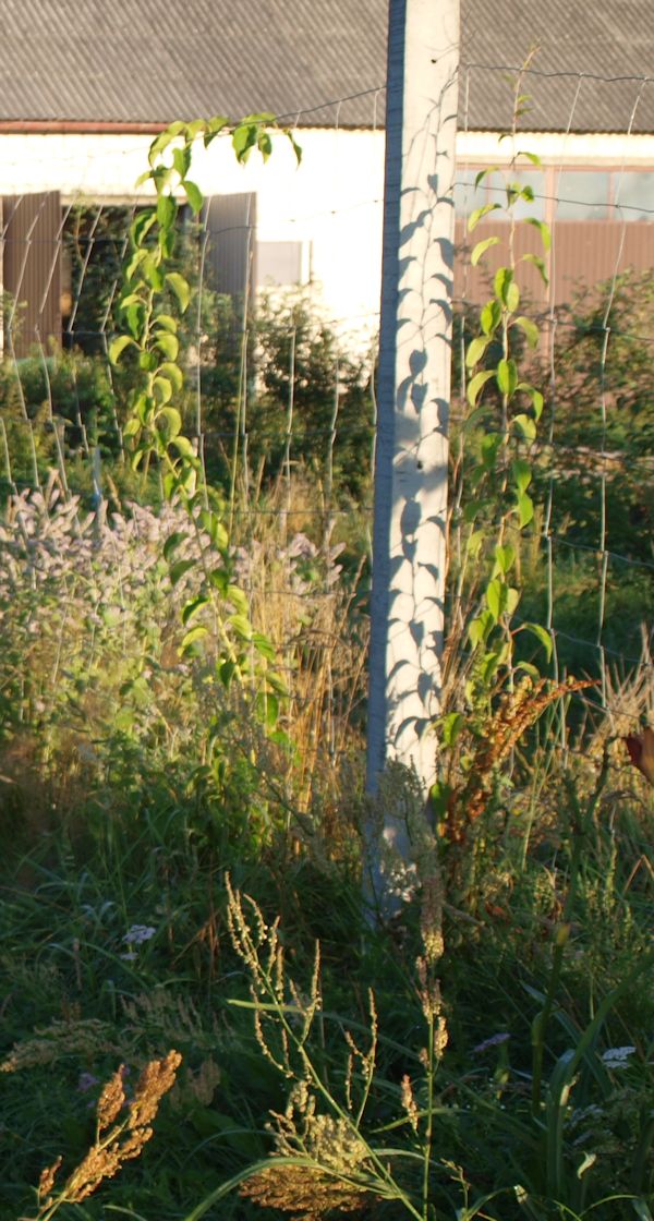 | Najnowsze zdjęcie na górze tej strony, tym razem zrobione od południa, pokazuje, że rośliny dobrze się zregenerowały. Tego dnia, 2 lipca, również zrobione zdjęcie największej mini kiwi „Purpurna Sadowa” z drugiej dostawy. Jest to bujnie rosnąca roślina na prawo, przy słupie.