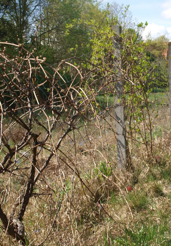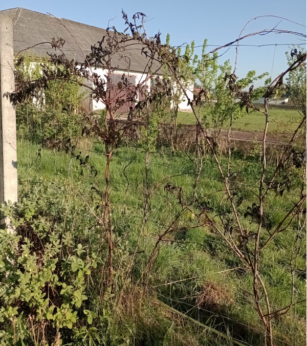 | | Okres pączkowania trwał od 13 do 22 kwietnia 2025 r. Na powyższym zdjęciu z 23 kwietnia widać wschodni koniec szpaleru, gdzie trzy mini kiwi „Purpurna Sadowa” z drugiej dostawy zostały posadzone między winoroślą po lewej a męskim mini kiwi po prawej. Na tym zdjęciu widać, że najwyższa z trzech (przy słupie) była ulistniona. | Mróz wrócil 28 kwietnia a jeszcze 6 maja było prawie trzy stopnie mrozu. Na zdjęciu z 29 kwietnia widać zamarznięte mini kiwi z pierwszej dostawy.