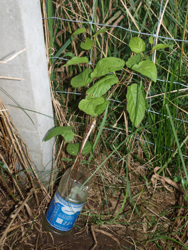 2023-2024Mini kiwi cierpią z powodu późnych przymrozków. Kiełkują szybko, gdy tylko przez tydzień jest słonecznie i ciepło z temperaturami około 20 stopni. W 2023 r. ciepły okres trwał od 20 do 24 kwietnia, a w następnym tygodniu wystąpił kolejny dwustopniowy mróz. Liście zamarzły, a najmniejsza sadzonka, która nie była jeszcze w stanie uformować zdrewniałej łodygi, zgniła. Druga roślina wyzdrowiała i zazieleniła się do wysokości ponad 40 cm w sierpniu. Rok później jej zielone liście osiągnęły wysokość 50 cm. | 2025Jedyna pozostała roślina również ucierpiała z powodu późnych nocnych przymrozków w 2025 roku. Zamarznięte liście odpadły, ale z podstawy rośliny wyrosły nowe pędy, jak widać na najnowszym zdjęciu na początku tej strony. | |