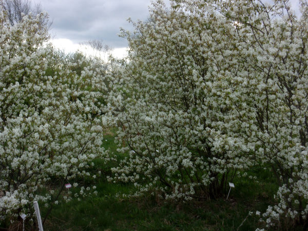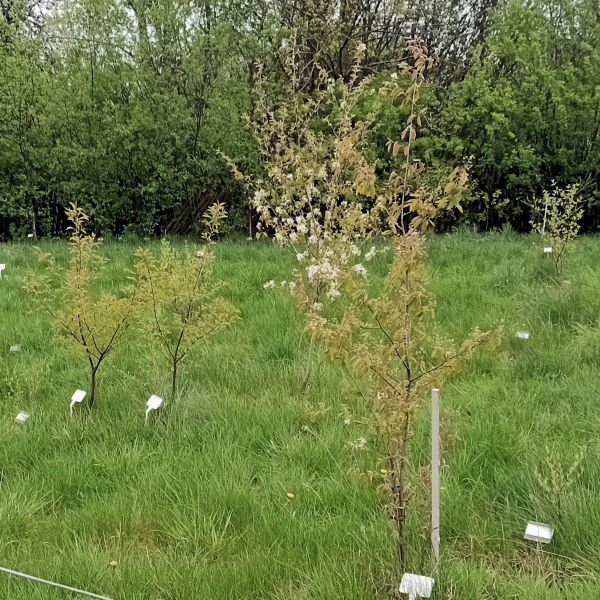2023W tym roku rośliny z drugiej dostawy owocowały po raz pierwszy. W sierpniu mierzyły 160 i 230 cm; starsze rośliny miały 300-390 cm wysokości.2024Zdjęcie na początku tej strony pokazuje, jak bujnie starsze świdośliwy kwitły 12 kwietnia. Na zdjęciu obok, robiono 22 kwietnia, na pierwszym planie widoczne jest zachodnie drzewko z drugiej dostawy, które wtedy już przekwitło. | Rośliny z pierwszej dostawy nie urosły już wyżej; pozostałe dwie miały 250-260 cm wysokości w sierpniu. | 2025Świdośliwy rodziły wiele owoców, ale one wysychały zanim dojrzały. |