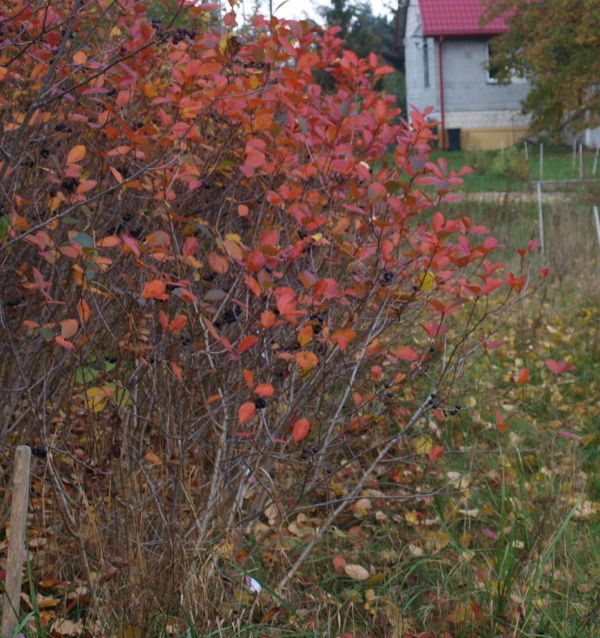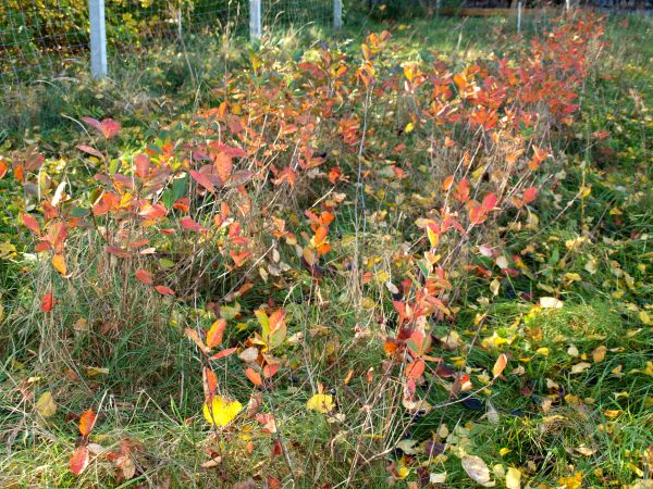 | 2020Od tego czasu wszystkie krzewy aronii owocują, oprócz dwóch.2021Wszystkie krzewy dobrze się rozwinęły, osiągnęły wzrost 110-190 cm. Jesienią (20-X-2021) krzewy aronii stanowią wspaniały pomarańczowo-czerwony akcent kolorystyczny.