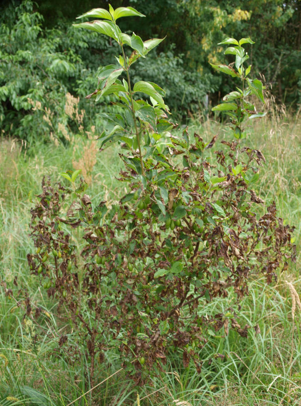 Z powodu długotrwałej suszy liście zwiędły, a owoce nie były soczyste. | 2024W sierpniu rośliny mierzyły 100 i 120 cm. | 2025W okresach suszy i upałów wiele liści dereni brązowieje. Po opadach deszczu pojawiają się nowe, zielone liście. Dobrze widać to na zdjęciu na początku tej strony. | |