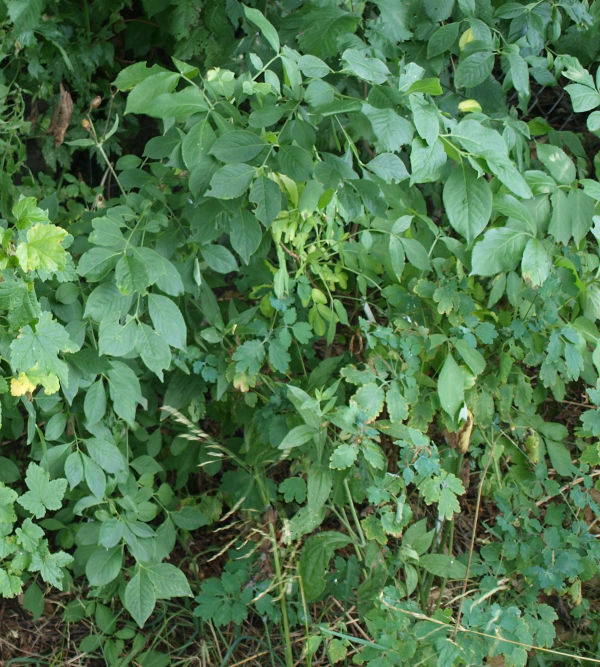 2022Dwie samosiejki trzmieliny odkryto w gęstwinie przy południowej granicy na polu. Wschodnia roślina mierzyła wtedy 90 cm; zachodnia 130. Tam nie przeszkadzają. Poniższe zdjęcie robiono 24 lipca.