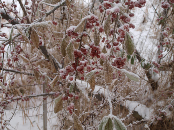 | Nie było czasu aby wszystkie owoce zbierać. Większość jagód nadal wisiała na gałęziach, gdy zaczęły się mrożne dni. W pierwszym okresie mrozów udało się zebrać jeszcze część. Te mrożone owoce były przepyszne. Kiedy po tym nastąpiła odmrożenie, pozostałe jagody zaczęły gnić. Poniżej: zdjęcie z 15 grudnia.