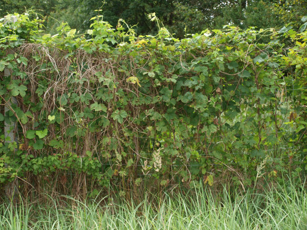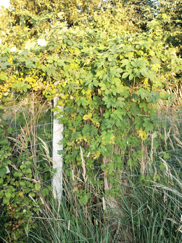 Na terenie pojawiają się samosiejki chmielu. Tam, gdzie szkodzą sadzonki, wyrwano je, natomiast przy szpalerach, gdzie jest wystarcająca odległość do innych roślin, mogą rosnąc swobodnie. Poniższe zdjęcie robiono 24 lipca 2022 r.