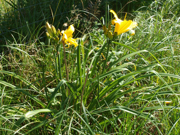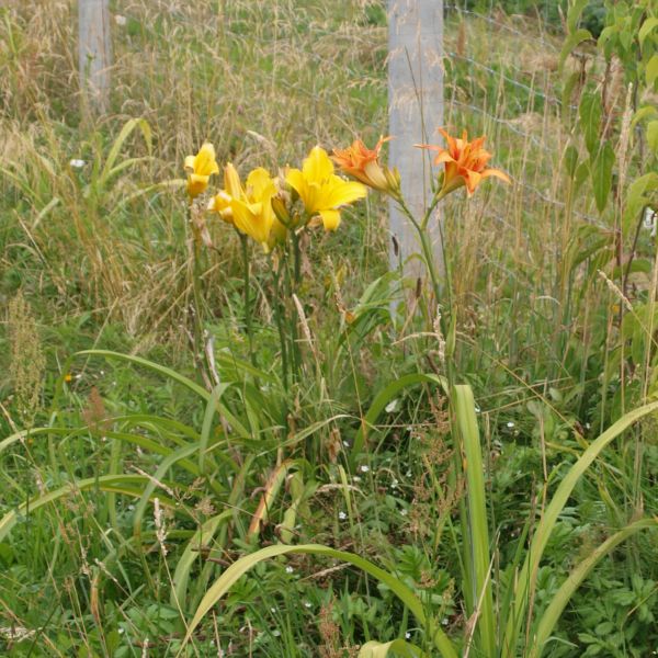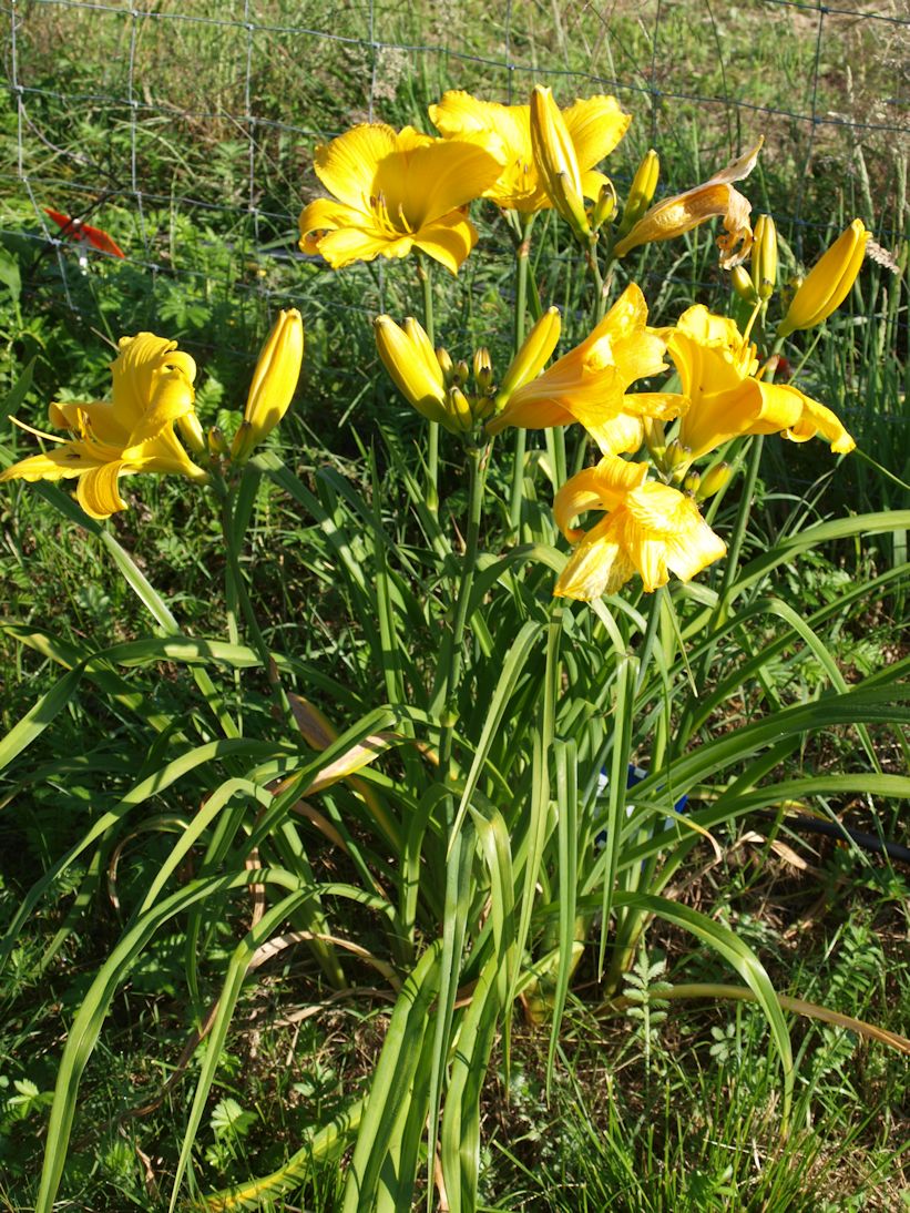 Na tym zdjęciu widać kwiaty liliowców hybrydowych Halina (żółte) i White Edge Madonna (purpurowe z jasnym brzegiem). | 2018Najbardziej wschodnia roślina i ta w środku nie zakwitły w tym roku.2019Następne zdjęcie żółtego liliowca Halina zostało zrobione 16 lipca.