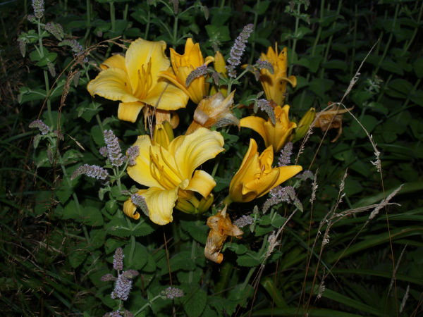 2021Środkowy liliowiec z nowu nie kwitł. W pobliżu wschodniej sadzonki wyrosła mięta.2022Mięta rozprzestrzeniła się szybko, otaczając liliowce, jak widać na zdjęciu z 24 lipca.