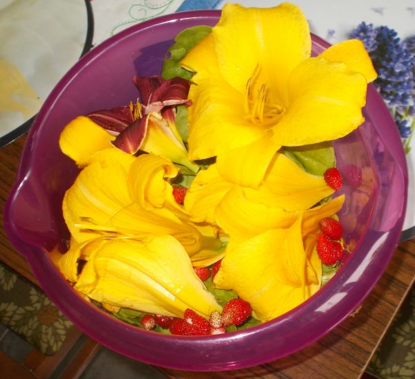 2017Jasno żółte liliowce hybridowe Halina rosły dobrze i kwitły pięknie. Kwiaty liliowców można jeść jak sałata, smakują jeszcze lepiej i dadzą surówkom i deserom bardzo ciekawy wygląd, jak pokazuje zdjęcie z dn 25-VII-2017 r.