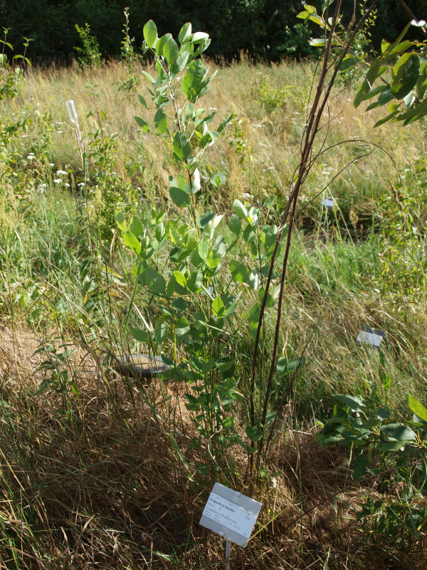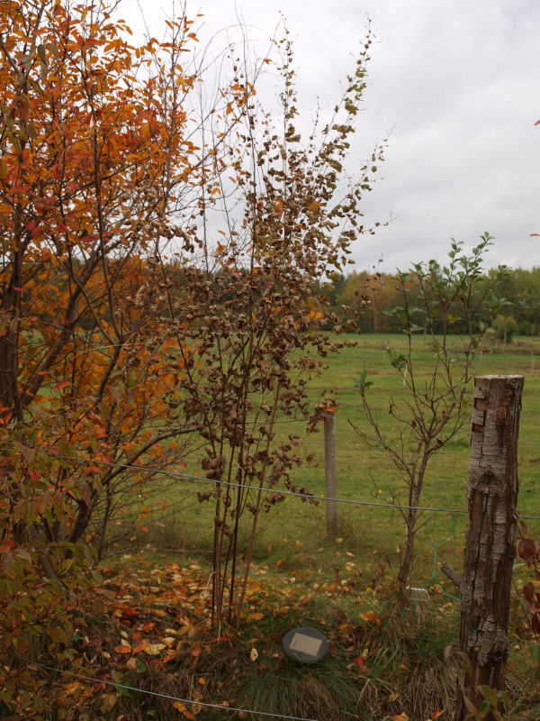 | 2017Sadzonki cierpiały następną zimę. U wszystkich pojawiła się grzybica. Chore gałęzie uschły. Wschodnia sadzonka pomarzła, trzy inne odrosły od postawy a tylko jedna (druga od zachodu) rozwijała się normalnie.2018Trzy rośliny przetrwały zimę 2017/18 roku. Dwie słabe sadzonki uschły pod koniec lata. Trzecia została podkopana przez norników ale wytrzymała wszystko. | 2019Jako jedyna, druga sadzonka od zachodu przeżyła też rok 2019, choć nie przyrosła nic przez cały czas. Mierzyła 100 cm, tyle co przy sadzeniu w 2016 roku.2020Liście pojawiają się u lespedezie dopiero w czerwcu. Zawsze jest niespodzianka, gdzie? W tym roku korona drzewka została łysa. Liście sięgały tylko do 50 cm wysokości.2021Całe drzewko było ulistnione i na dodatek szybko rosło. Wysokość w sierpniu to 190 cm. | 2022Jak widać na zdjęciu z 24 lipca, najstarsze pędy znowu zostały łyse.