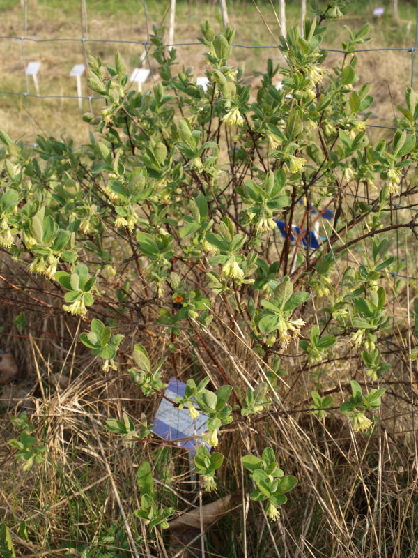 2019-2021Sadzonki rosły dobrze i w roku 2019 miały pierwsze owoce. Były bardzo smaczne. W lipcu 2020 r. zachodnia sadzonka mierzyła 70 cm i wschodnia 60 cm.2022Te jagody kamczackie rosną dobrze, przede wszystkim w szerokości, i owocują co roku. Pierwszego maja kwitły, jak widać na następnym zdjęciu. |