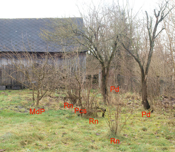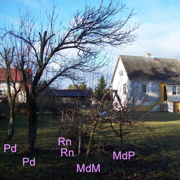 2014Jedna papierówka rosła w starym sadzie na podwórku, kiedy kupiono działkę. Na zdjęciu starego sadu, które zostało wykonane ze wschodu 21 grudnia, drzewo (MdP) znajduje się na prawej stronie.