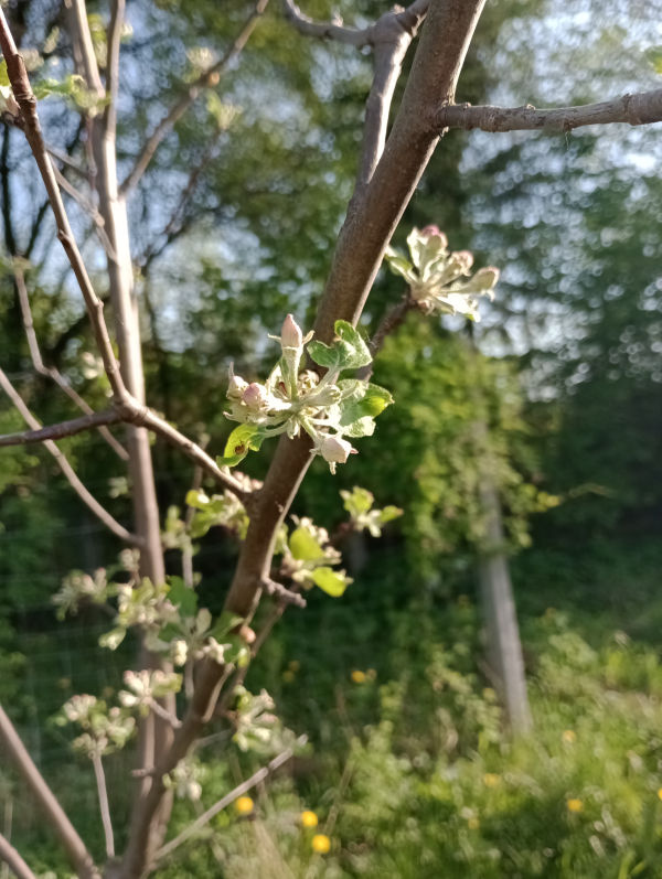 Tak więc, nowe jabłonki owocują w parzystych latach, tak samo jak jabłonie w starym sadzie na podwórku. | 2024Zdjęcie z 30 kwietnia pokazuje kwiaty południowej jabłonki.