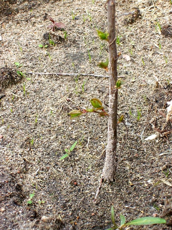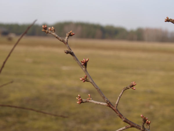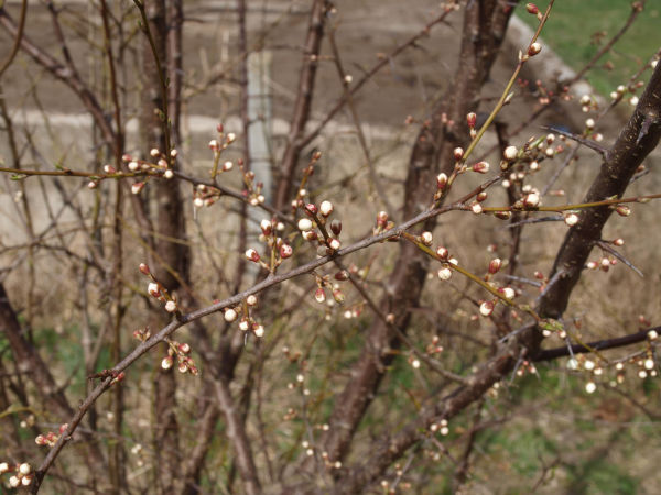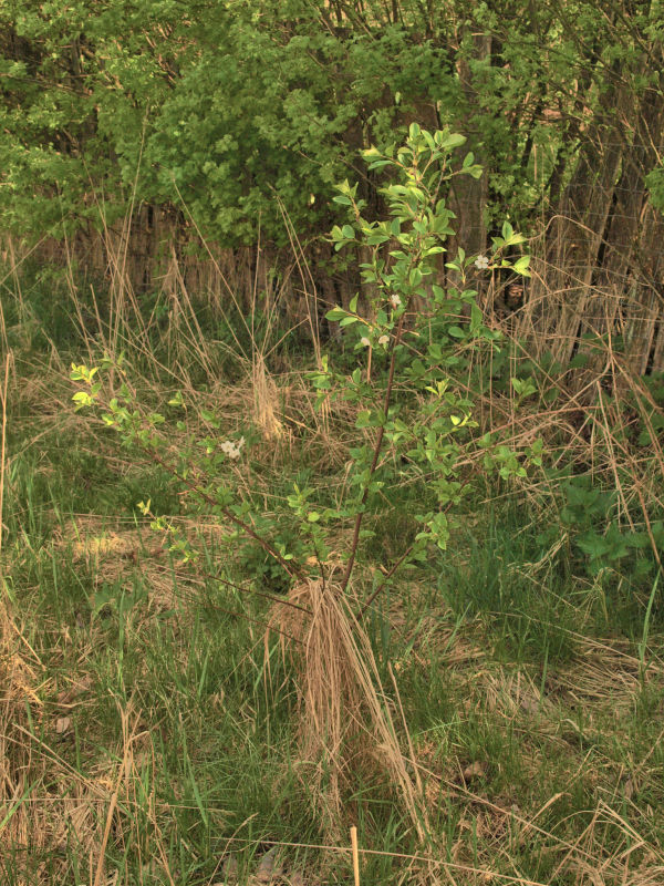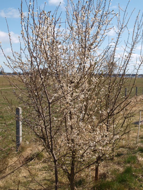 | 2018Oprócz sadzonych roślin, pojawiły się samosiejki śliwy wiśniowej. Zdjęcie z dnia 29 kwietnia pokazuje kwitnącą samosiejkę na polu przy płocie południowego sąsiada.