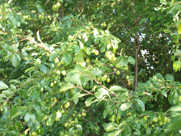 | 22 sadzonych drzewek i 2 samosiejki owocowało. Cztery sadzone wiśnie miały czerwone owoce, pozostałe drzewka żółte. W sierpniu sadzone drzewa miały 2,5-6,0 m wysokości. Średni wzrost to 4,3 m.2024Jedna, 4,4 m wysoka, śliwa wiśniowa w północnym żywopłocie nie wchodziła w wegetacji. |