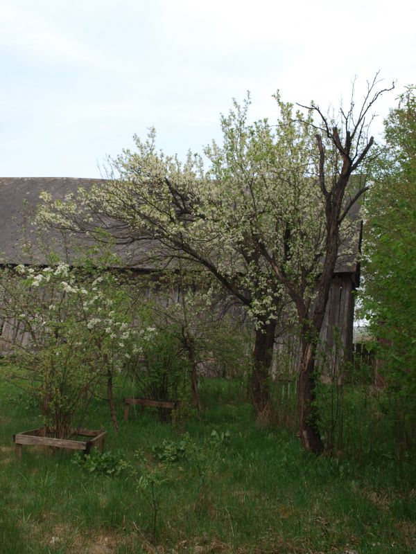 | 2022Na zdjęciu z 10 maja widać stare śliwy w pełnym rozkwicie za gruszką i pojemnikiem.