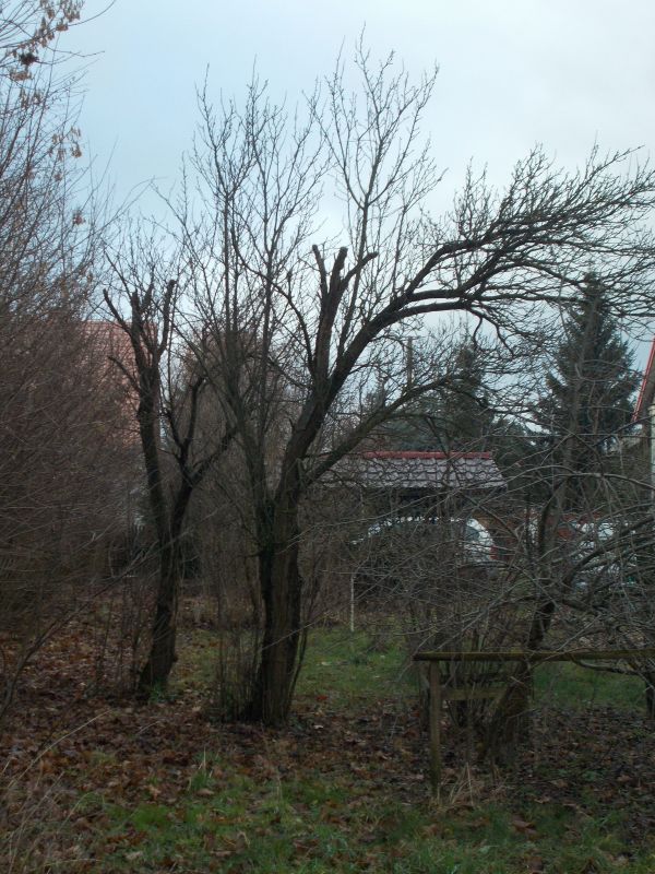 2014Dwie śliwy rosły w starym sadzie na podwórku, kiedy kupiono działkę. Na zdjęciu starego sadu, które zostało wykonane ze wschodu 21 grudnia, śliwy (Pd) znajdują się na lewej stronie.