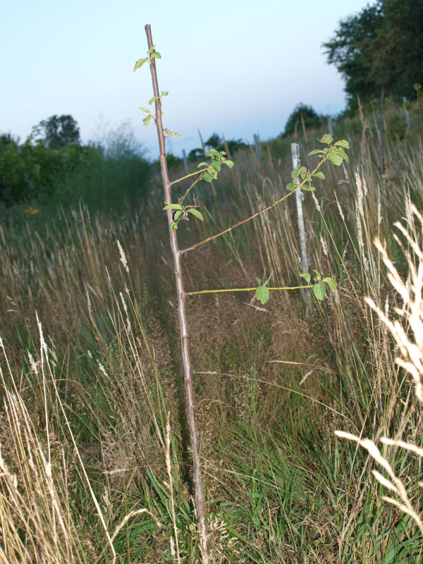 Mirabelki przyjęły się ale nic nie rosły z powodu suszy. Na zdjęciu z 24 lipca widać, że południowa sadzonka była słabo ulistniona. Druga sadzonka wyglądała podobnie. |