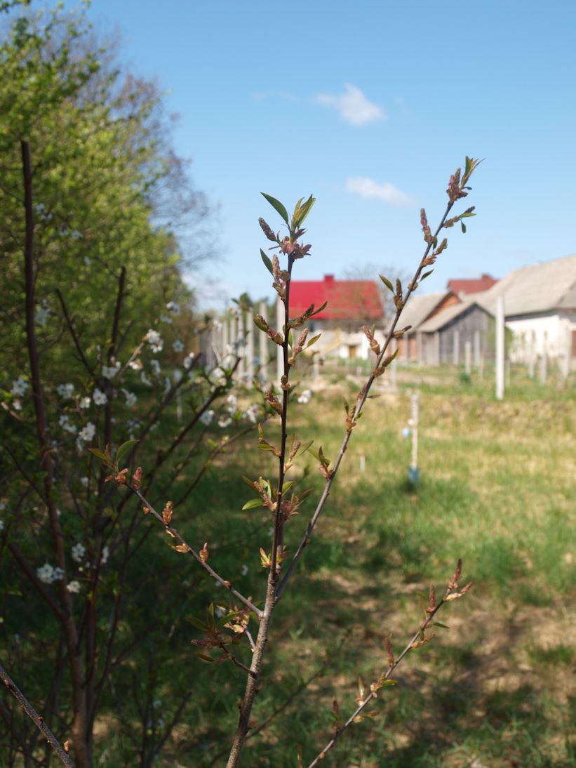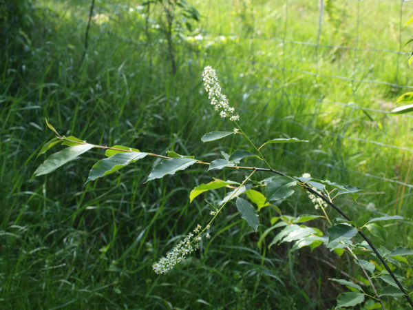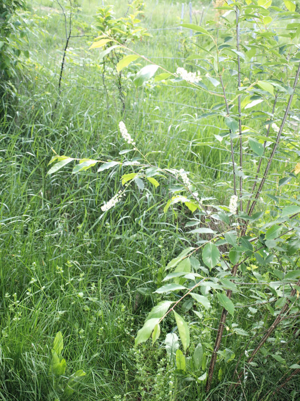 | 2020W lutym 2020 r. przesadzono samosiejki śliwek, wiśni i czeremch, przedłużając południowy żywopłot ku zachodu. Zdjęcie z 7 maja pokazuje tę samą czeremchę na nowym miejscu, z kwitnącą wiśnią na tle.