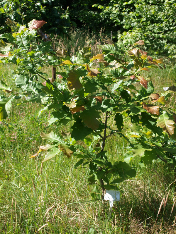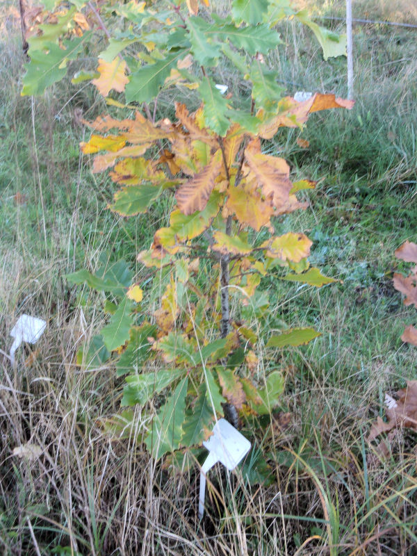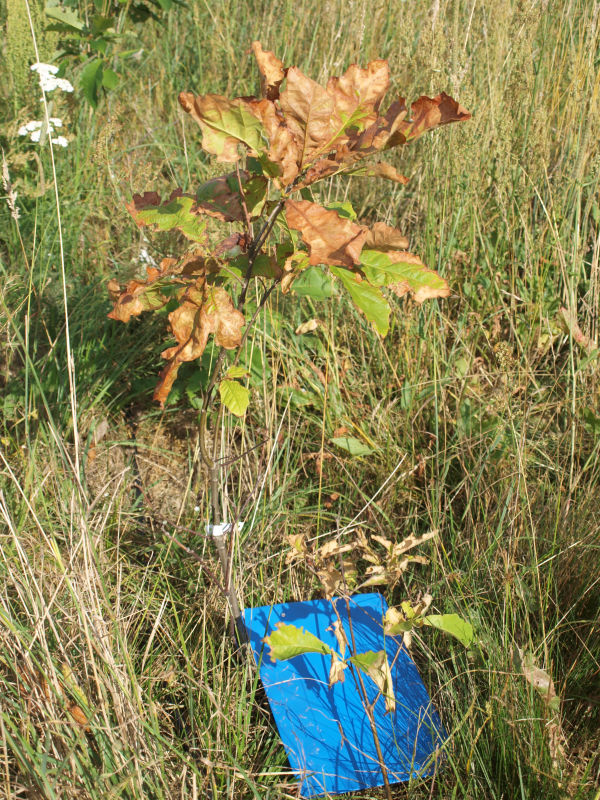 Sadzono je w bindaży, gdzie zastępują derenie w wschodniej części alejki.2021Wszystkie sadzonki przyjęły się ale w wrześniu dwie rośliny leżały płasko na ziemi.2022W styczniu kolejna sadzonka upadła. Dopiero pod koniec maja pojawiły się nowe liście na dębach. Powalone drzewka nie zieleniały. Wtedy okazało się, że to dzieło pędraków. Sadzonki nie miały już korzeni. Pozostałe drzewka rozwijały się dobrze, ale gorące i wyjątkowo suche lato dało młodym roślinom kolejny cios. Jedna sadzonka tego nie przeżyła. W sierpniu było jeszcze 16 żywych dębów dwubarwnych. Mierzyły od 20 do 115 cm. Średni wzrost był 60 cm. |