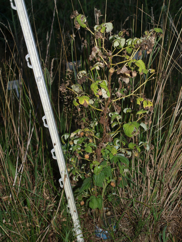 Dwa miesiące później, 16 lipca, już owocowała. |  | 2020Malina rosła 8 cm i owocowala.2021W tym roku, roślina rosła 30 cm, owocowała i mierzyła w sierpniu 70 cm.2022Gorące i wyjątkowo suche lato szkodziło malinę. Jak widać na powyższym najnowszym zdjęciu, 24 lipca miała liczne owoce. Nie dojrzewały niestety. Uschły i odpadały. W sierpniu roślina była wyschnięta od połowy. Zielone liście sięgały tylko 35 cm wysokości. | 2023Malina rosła ale nie kwitła. W sierpniu miała 50 cm wysokości. | 2024Ponownie malina ucierpiała z powodu suszy i upałów. Dopiero w maju wchodziła w wegetacji. W sierpniu zielone liście sięgały tylko 20 cm wysokości. | |