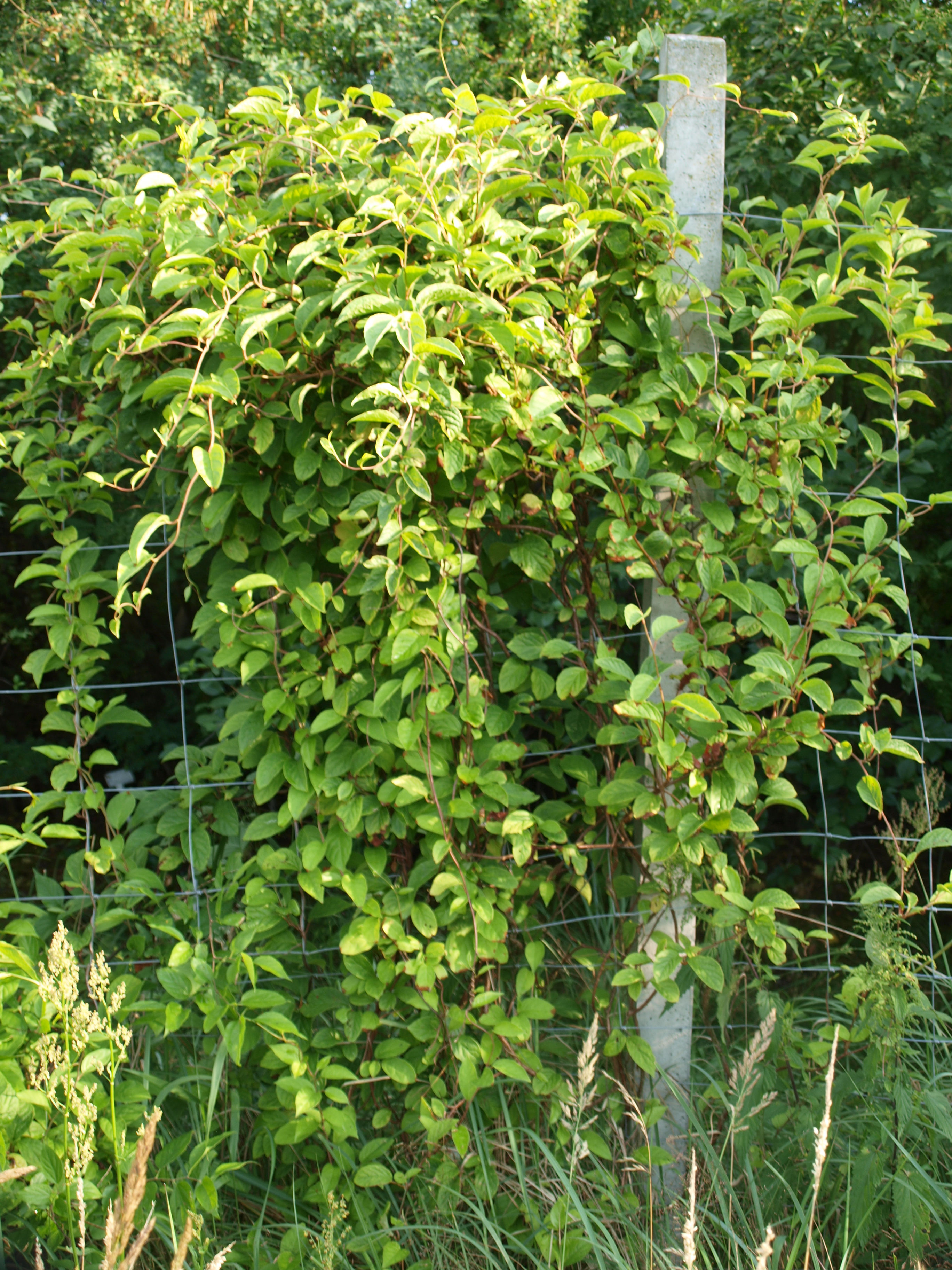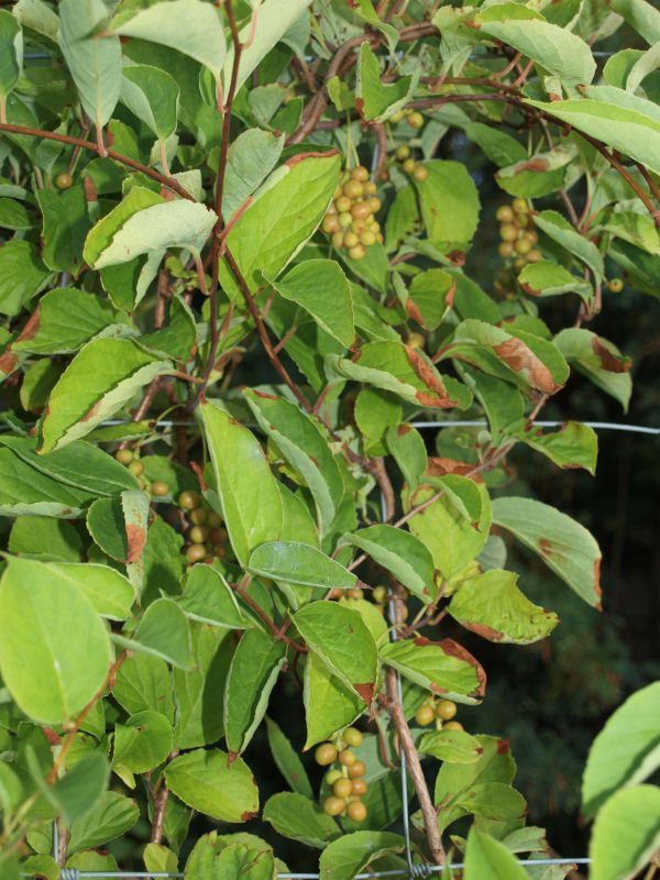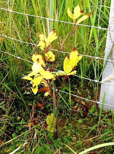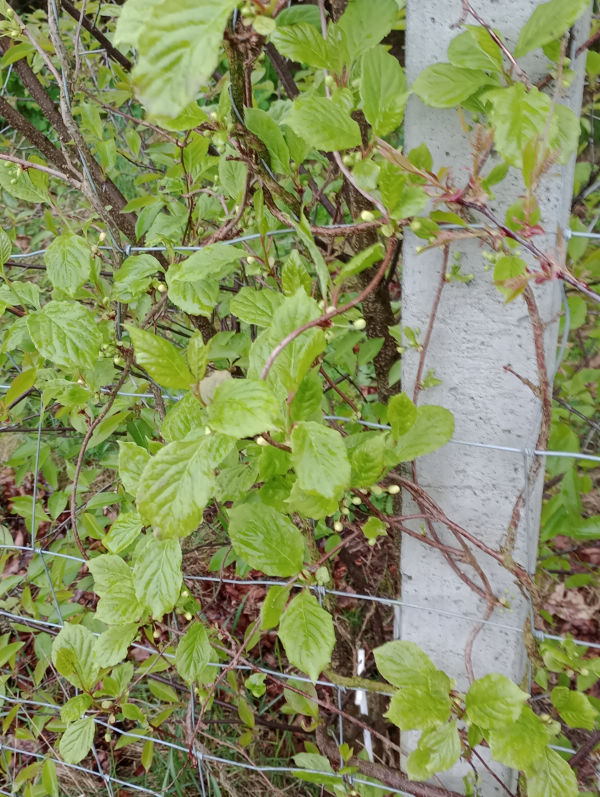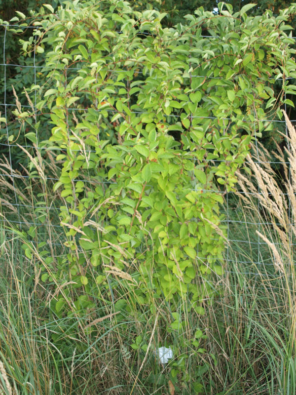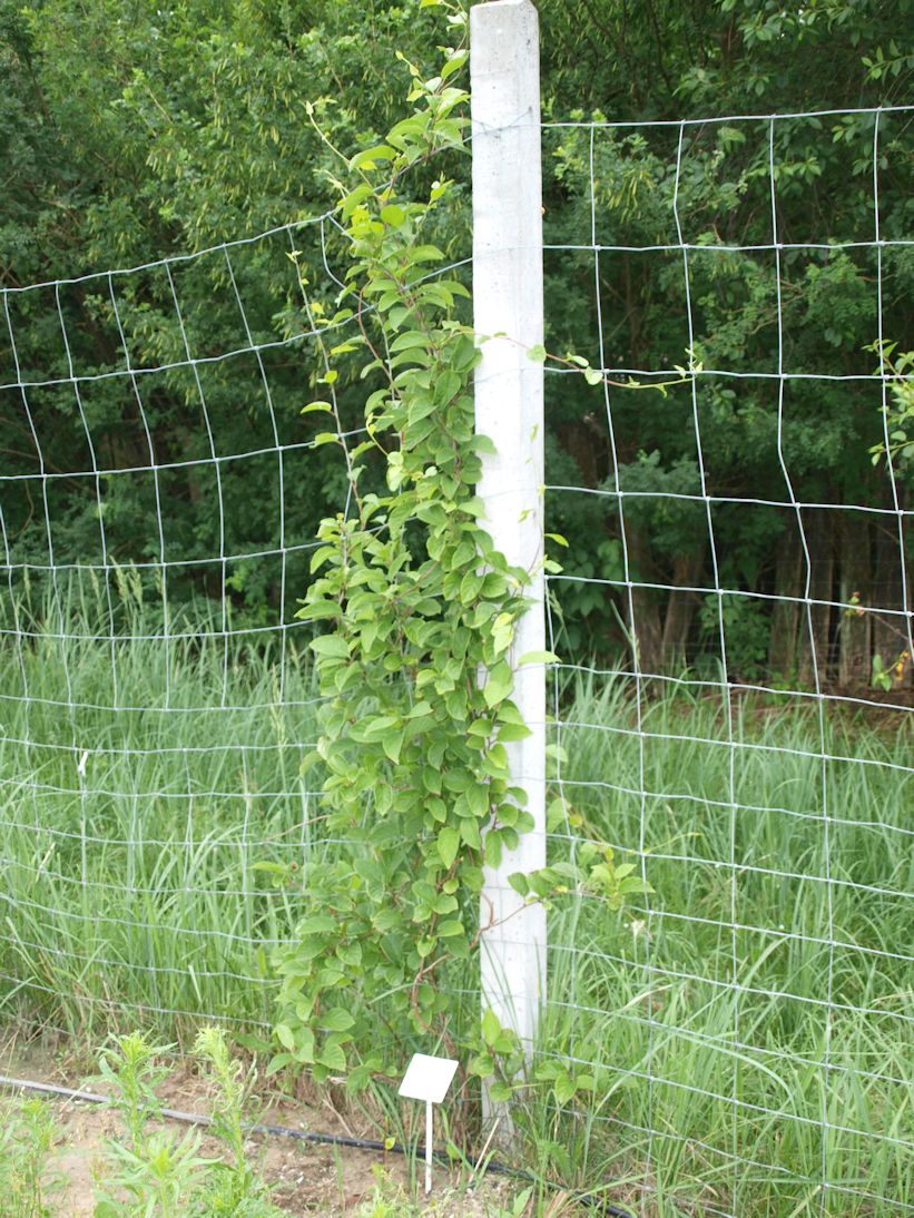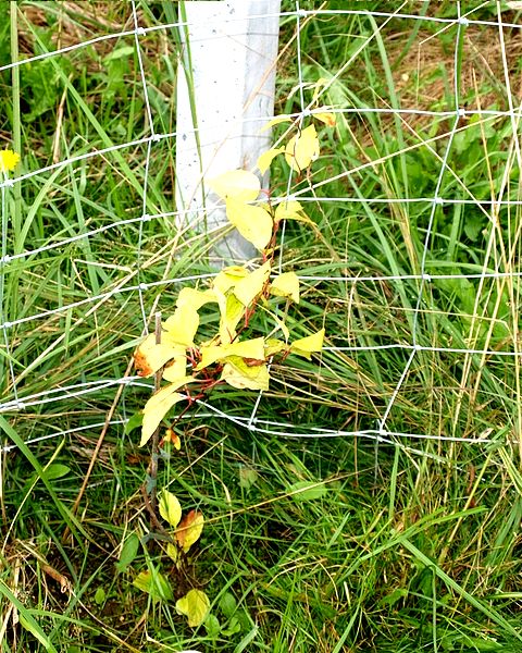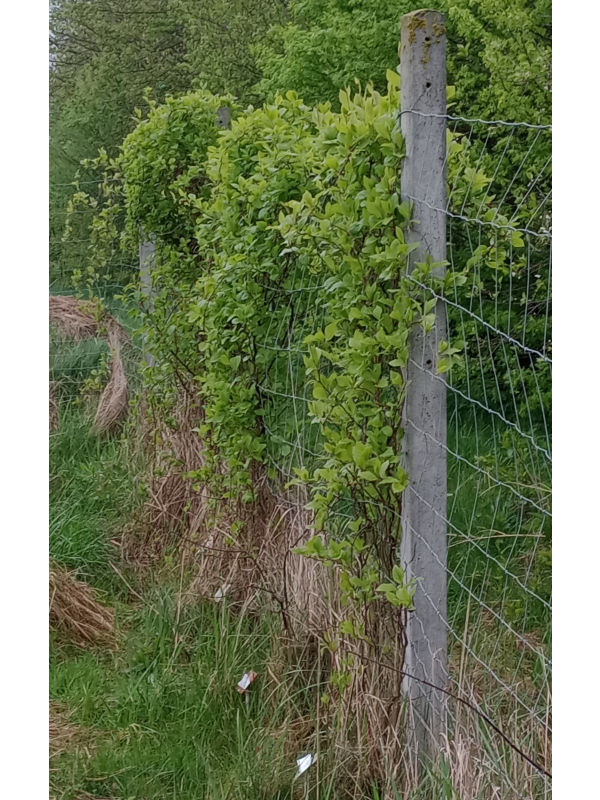 | 2017Cytrynowce lubią cień. Południowy szpaler stoi w cieniu i wszystkie sadzonki przy nim rosły dobrze. Wschodni szpaler natomiast stoi w pełnym słońcu. Trzy w październiku sadzone (mniejsze) sadzonki tam nie wytrzymały upalne dni. Zostało więc 23 cytrynowców.2019Młode liście wszystkich cytrynowców zamarzły na początku maja, ale rośliny szybko wróciły do zdrowia. | 2020Większość roślin rozwijało się dobrze. Pięć cytrynowców kwitło w maju, ale żaden nie owocował. Wschodni cytrynowiec z drugiej dostawy osiągnął szczyt dwumetrowego ogrodzenia, jak widać na zdjęciu z 23 czerwca.