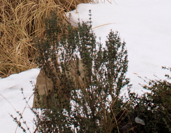 2021W tym roku wszystkie pięć rośliny kwitły i owocowały.2022Na wiosnę dwa krzewy wysychały. W maju wyzdrowiały, ale były poważnie uszkodzony. Jeden nie kwitł i w sierpniu jego zielone liście sięgały tylko 13 cm, drugi zieleniał do 20 cm, gdy pozostałe rośliny mierzyły 40-50 cm.2023Na najmniejszą roślinę wyrosły nowe liście dopiero w sierpniu. Miała wtedy 25 cm wysokości, wschodnia 30 cm, zachodnia 48 cm i pozostałe 40 i 44 cm. | 2024Na zdjęciu z 26 stycznia widać zachoni krzewik.