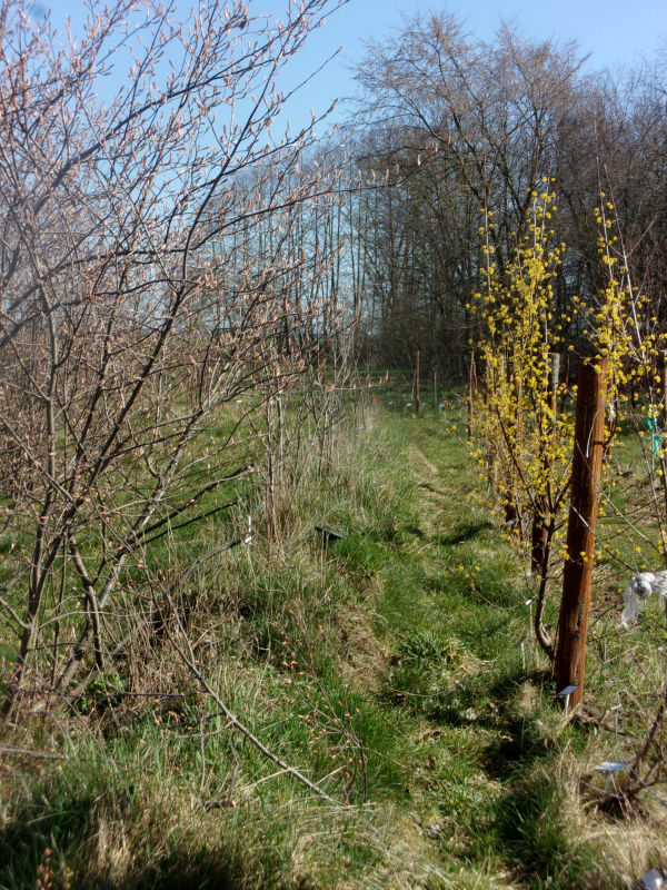 Bindaż miał stanowić ozdobne przedłużenie ścieżki na polu, między północnym żywopłotem a ogrodzeniem. W kwietniu 2015 roku sadzono sto 30 cm wysokich dereni jadalnych. Prawe zdjęcie przedstawia zachodnią część alejki w dniu 6 stycznia 2017 r.