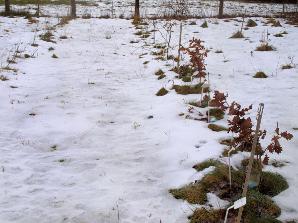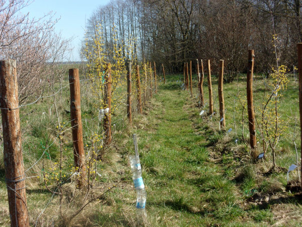 W marcu 2024 roku derenie i dęby były wystarczająco duże, aby utworzyć bindaż. Ustawiono słupki z drutami, aby poprowadzić po nich gałęzie. Wynik można zobaczyć na zdjęciach.