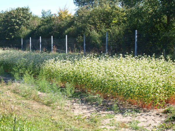 Żywopłoty składają się z roślin jak, śliwa wiśniowa, karagana, oliwnik, aronia, nieszpułka, glediczja, howenia i kalina. Na szpalerach rośnie mini kiwi, winorośl, cytryniec, akebia i chmiel. Dalsze drzewiaste rośliny na polu to: porzeczka czerwona i biała, agrest, jeżyna, malina, jarzębina, dereń, cedrówka, wiązowiec i tymianek. Z bylin zimujących należy wymienić szparag (25-metrowy rząd), liliowiec (35-metrowy rabat), miętę, lubczyk i rabarbar.